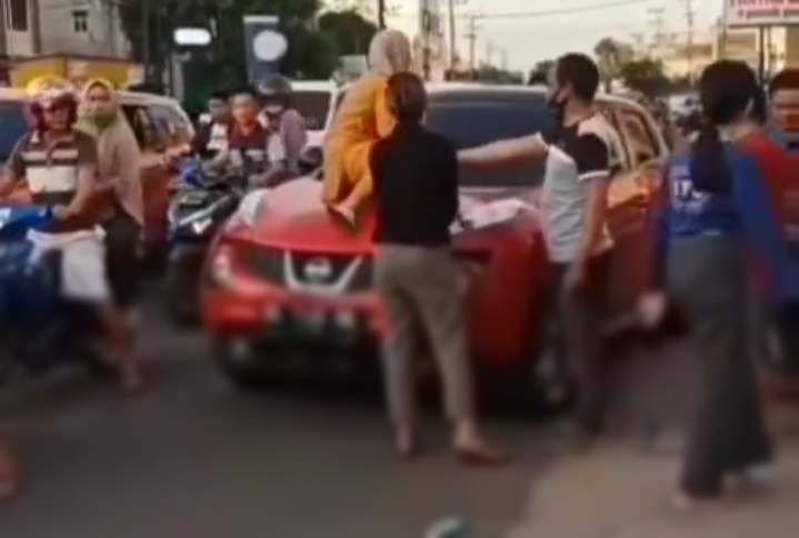 Seorang Ibu muda berpakaian gamis orange dan berjilbab coklat muda nekat menghadang dan menaiki kap sebuah mobil nissan yang berjalan pelan ditengah keramaian.
